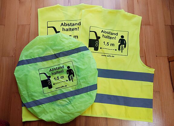 Der ADFC Augsburg bietet Rucksackhüllen und Warnwesten mit Überholabstands-Hinweis an.