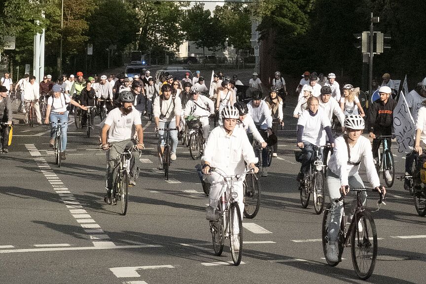 Gegen 18:45 Uhr startete dann der Ride of Silence in Richtung Oberhausen. Über 100 Teilnehmende fuhren dabei schweigend und in weiß gekleidet eine ca. 5km lange Route durch die Stadt. Nach einem Zwischenstopp am Königsplatz mit einem Redebeitrag und einer gemeinsamen Schweigeminute ging es weiter zum Wittelsbacher Park, wo die Teilnehmenden den Abend gemeinsam ausklingen ließen.